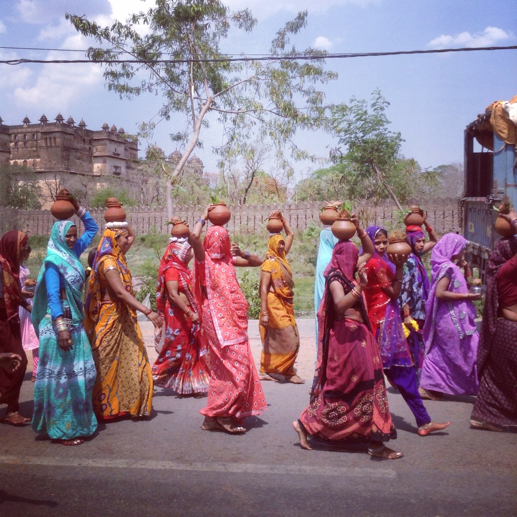 Today's adventure was just down the road to the Cenotaphs, monuments to the dead kings of the area. From there, I took the path along the Betwa River, and ran into a party. Quite literally. Along the narrow path, between the rocks and the river, heralded by the beating of drums, came a procession of parrot-colorful women, carting on their heads terracotta urns with coconuts and teak leaves and trailed by an equal number of men. Before I knew it I was surrounded with staring faces and a girl about my age was pushing to front. Her English was a heck of a lot better than my Hindi so she introduced herself and explained that it was a holy day so the town was celebrating, starting with collecting water to take to the temple. The next hour passed in a sweaty rainbow blur as I was introduced to tens of sisters, aunties, mothers, friends, cousins – and held countless babies. I was then tugged around by the hands of the little ones to visit their houses.