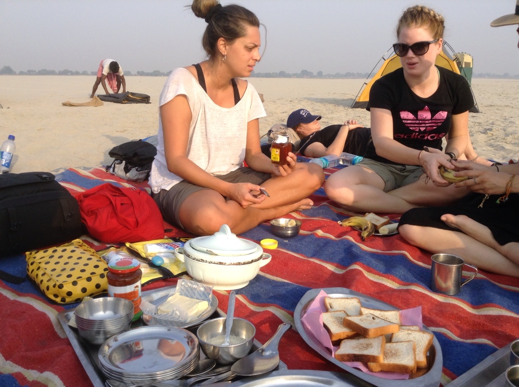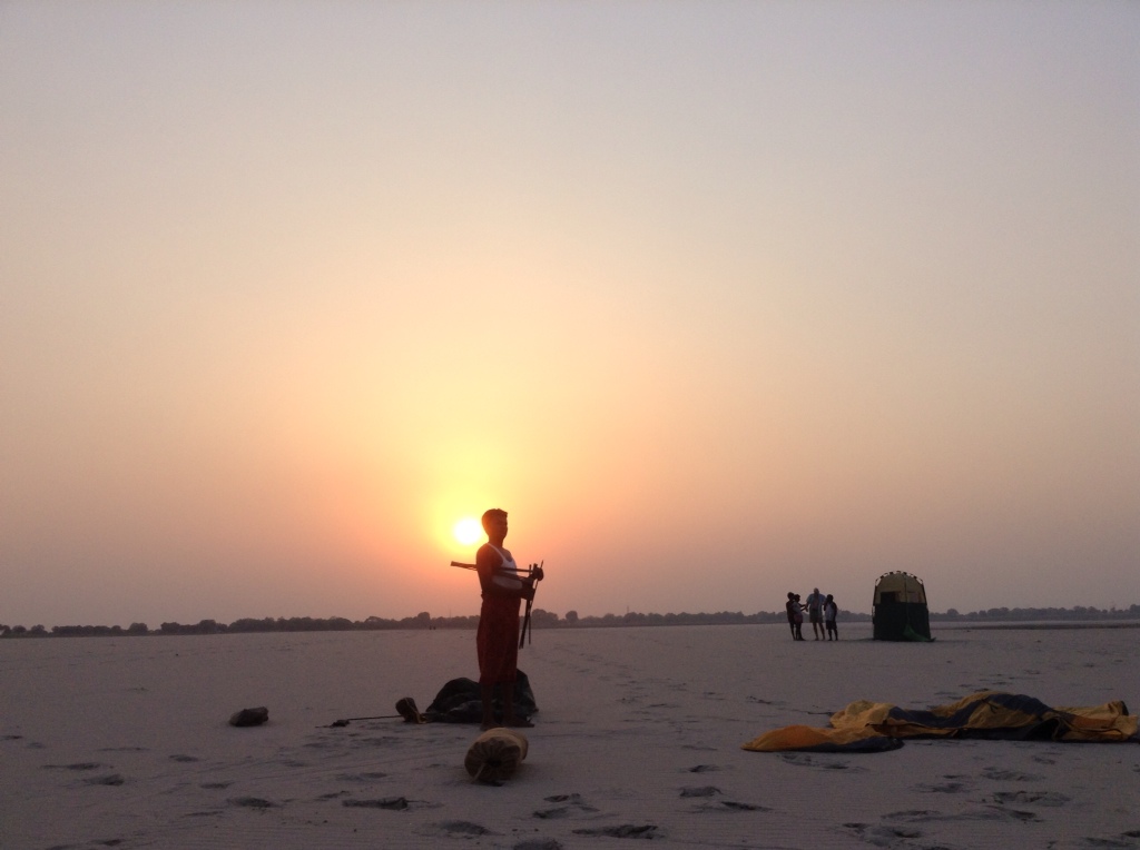 (Snarky interlude: After setting up our tiny “two man” tents”, the crew and the boys played beach cricket. The Terrific Texan went down sliding for a catch, squealing in pain. I may have rolled by eyes but, if so, no one saw so it doesn't count. He insisted upon being carried by the crew to our girl castle/the central groundsheet and deposited in our midst (breaking our hair braiding circle), then upon the tour leader inspecting his groin (awkward for everyone). Whilst Texas was claiming that he had tunnel vision, moaning and rolling — despite instructions to keep still — and generally being dramatic, our tour leader made it clear that he had to decide whether he needed to go to hospital ASAP as the sun was dropping and we were just off centre in the middle of nowhere. The histrionics continued. Cutting a long, loud story short, a boat came for him and he was taken away for the three hour drive to Varanasi in pitch black. Spoiler alert: he'd sprained a muscle and was dehydrated again. Honestly.)