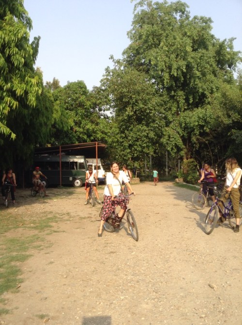 In the afternoon we took bikes around the local villages. The roads were mud and rocks and I can no longer feel my butt, but riding through the jungle was magic. I fell in a bush. Before that inauspicious event, we saw: colourful kids at play in the streets, tall elephants at work (the shock is what caused the bush incident), baby goats with mama, a chicken get beheaded, grass and mud houses, women collecting snails from the river for dinner, men pumping water, the dark wet jungle.
