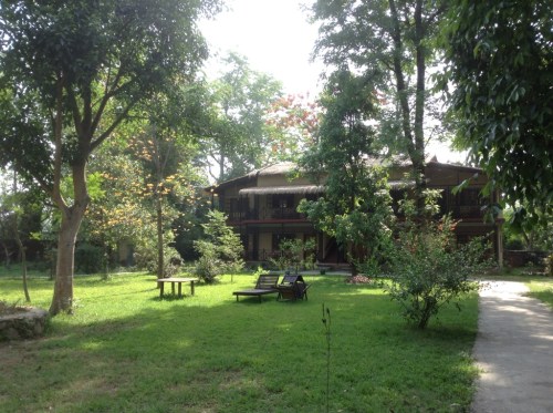 Yesterday, after 5 hours driving from Lumbini, we pulled off the main road out of Chitwan village and went through a series of smaller villages. The scenery grew greener. We passed crude arrow-shaped signs bearing labels like 'Rhino Resort', 'Jungle Camp', 'Ripty Riverview'. In the village of Sauraha we followed the signs to 'Royal Park Hotel' and pulled into a lush jungle shangri-la. Ok, so my standards have been lowered into the dark fathoms by India, but this place is lovely. It's a collection of jungle bungalows (did you know that 'bungalow' is a Hindi word?) in a park with palms and hibiscuses — and giant hemp plants. The bungalows are basic but they have fans, and showers and toilet paper and mosquito coils and we're thrilled.