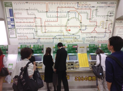 There’s also wifi everywhere: malls, trains, smoking points. This comes in handy when you, as I frequently do, get really lost. For example, first thing yesterday. As I (as we’ve already discussed, somewhat dozily) stepped off the Narita Express train at Shibuya station I experienced something I’d previously thought only to be a literary expression: a wave of sheer terror. People. Everywhere. Signs. Everywhere. Japanese. Everywhere. Panic.