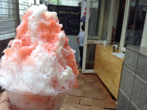 On a Sunday afternoon — as this was — you find yourself in a technicolor zoo of cos players, Sailor Moons wannabes, goth princesses and Lolita girls made up to the nines, in unthinkable heels, staking out their respective territories by the station and in Yoyogi park. The backdrop to this spectacle is a glittering, neon rainbow of brilliant costume, novelty sock and sticker stores and elaborate dessert cafés — to one of which I made a beeline as sugar seemed the perfect chemical to add into my bloodstream cocktail right now. The cafe in question was a tiny place called Milk And Honey and I had…. you know, I’m not sure precisely what I had. A towering confection of shaved ice, icecream, strawberries and syrup.