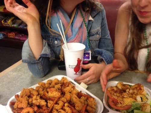 The highlights include (wisely) deciding food was a sensible option and hoeing into a pile of deep fried crawfish and poboys; our new friends — Mr Love, the doorman at Pat O’Brien’s, and our private dancing saxophonist at the deserted 365 Bar — adopting a boys trip from upstate New York, karaoke at the Cat’s Meow, breaking my wet shoes on the dance floor and having to buy new ones at midnight on Bourbon St (they’re glittery, heeled things emblazoned with gold fleur de lis — I love/hate them), Hand Grenade drinks at Tropical Isle, losing Tassels, test tube shots of fire whiskey at Razoo, learning a new line dance, losing and refinding everyone, last drinks (water, at that point) at the pirate Lafitte’s Blacksmith, losing Tassels again, raiding the corner store for post midnight snacks, Tassels deciding she needed more cookies and dashing back out before our slowed reflexes could catch her.