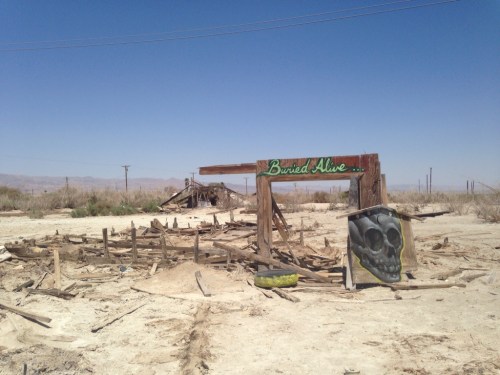 The canyon hike itself was an amazing 8km adventure through rocky crevices, up strategically placed ladders and across sandy cliffs, with a spectacular view of the valley below. Unfortunately, about two hours in, our water supply that had seemed so heavy and abundant at the start of the walk dried up, the sun ceased kissing our flesh and started to bite and we trudged into silence. I highly reccomend the hike, but not around midday in 107 degrees. Sweaty and bedraggled, we refuelled with lunch (Mexican, obviously) then toured the shores of the Salton Sea. The ‘sea’ is a salted lake that, as it evaporates, grows saltier and saltier each year. Bombay Beach is a failed lakeside development on its shores. Something horrendous seems to have wiped out the majority of the buildings in the community and the remaining 230 residents fly pirate flags and eke out a lonely, gritty existence eating tilapia from the lake and fending off fatalistic graffiti artists. ‘The Hills Have Eyes’ is scrawled in red across one house, ‘Abandon Hope All Ye Who Enter’ on another. It’s beautifully depressing.