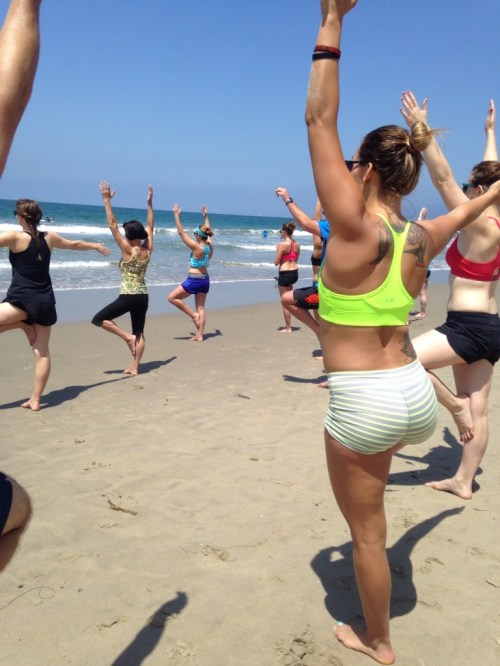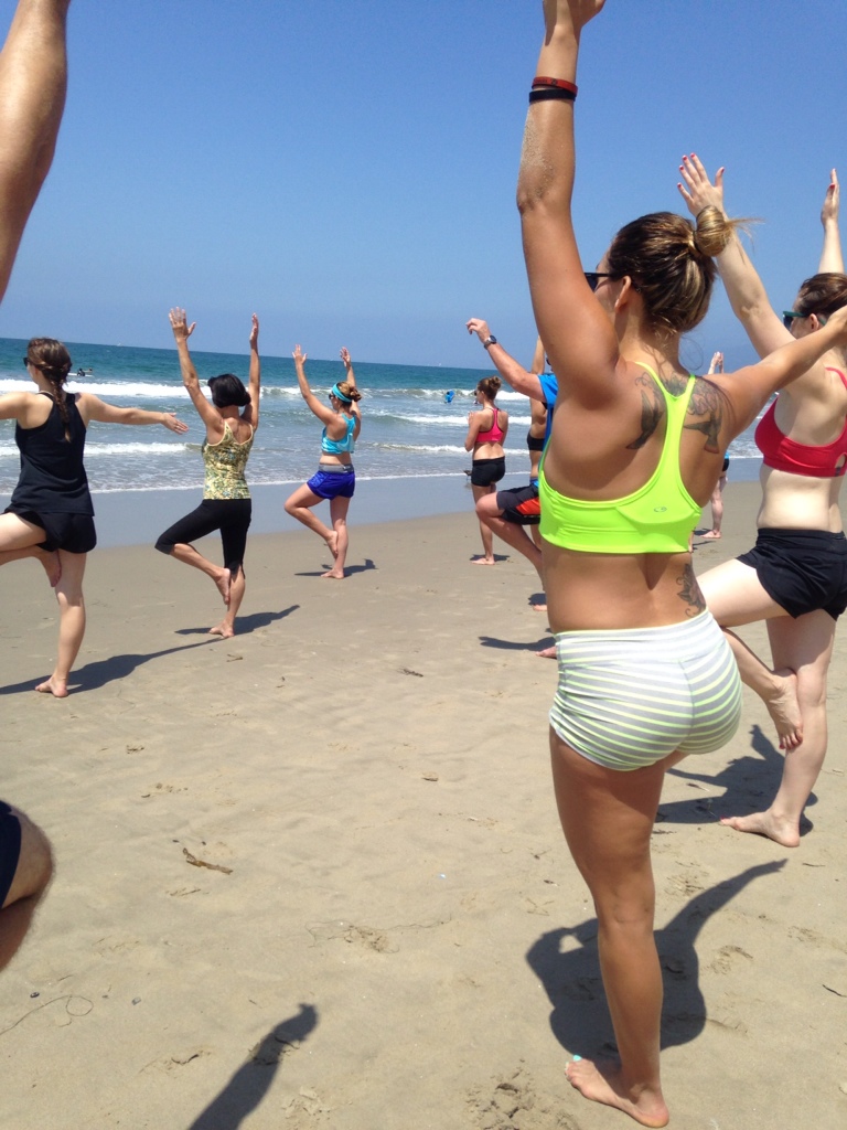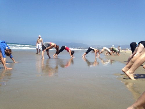 That would be Brad, our yoga instructor for this morning’s beach yoga class in Santa Monica Beach by lifeguard station number 29. Like almost everyone else in LA, Brad’s a slashie. You know, like an model-slash-waitress or a model-slash-actress-slash-bartender. He’s a yogi-slash-conductor-slash-film-consultant and, this morning, lead us through an hour and a half of pranayama in the sunshine, downward dogs with our toes and hands in the surf and tree poses on the wet sand. And we did see dolphins, loads of them.