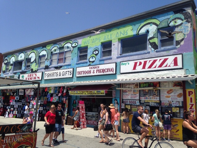 On the Venice Beach boardwalk for sale are tee-shirts in every shade of neon bearing every shade of offensive catchphrase imaginable (from ‘cool story babe, now go make me a sandwich’ to words I could have used while trying to zip up my rucksack this morning), weed and it’s crueller cousins, the ugliest ‘art’ you’ve ever seen, pizza, fries, trucker caps. Tattoo parlours occupy every third store. The weirdos are tricky to dodge. Their pets are alarmingly cute. The sun beats down on a large expanse of sand and a smattering of lanky palm trees. Boom boxes compete. Street artists hustle. The beggars could put the streets of Delhi to shame. Also, again as with India, it’s fun and colourful — but you take your life in your hands if you eat there.