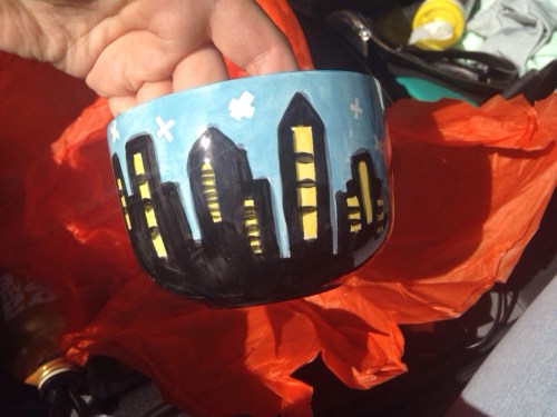 Have I mentioned the recently discovered addiction Bunky & I share? Painting ceramics and gossiping at All Fired Up? Well, this is Bunky's latest artwork: giant mug with skyline. Too cute! My goodness, we're going to make sure awesome little old ladies one day...