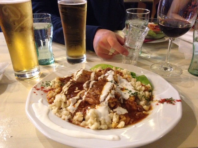 That night we had dinner at a teeny tiny local restaurant that was just large enough to seat the nine of us (the 3 cousins haven flown home that afternoon) and a few hapless couples. Hungarian food is a delight. It has the strong potato focus of German food, but the more delicate spice of a country closer to Asia. There's paprika in everything! The table was soon covered in goulash, Transylvannian meat platters, dumplings, cabbage rolls and other paprika-dusted delights. As a group we decided to finish dinner with a shot each of the local aperitif, palinka. It burned. But kept us warm for the walk to a bar.