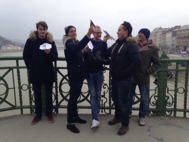 By 1pm, things were looking significantly livelier in the flat. Coffees were in hands and we'd vaguely decided to stroll down to and then along the Danube to a goulash restaurant that the journalist swore by. Safely ensconced on the top floor of this warm pub, beers breathed more life back into us. The goulash did its bit too. The pub welcomes you to draw on your placemat and leave it tacked to the pub wall so I borrowed a pen and scrawled, drawing the crew and taking suggestions. However, no one else was feeling particularity arty. Instead, a paper plane competition was conceived and there was much trash talking as, after the meal, we all trouped out into the square to compete, Cooper crowed shamelessly when he emerged victorious (not the most amazing aeronautical feat given that at least two planes flew backwards).