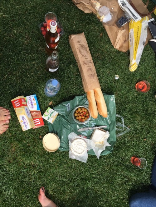 We all meet up and picnic in the sun at the foot of the Eiffel Tower and drink wine. Then we learn that selfie sticks are weapons in the hands of drunk people. Then we wander along the Seine and drink Aperol in the hot sun. It starts to rain around the time we pretend to be locals and speak French to get into a barge bar (I'm briefly devastated when the bouncer searches my bag and insists upon throwing out the Petite Ecoliere biscuits leftover from the picnic and I have to pretend I'm too frenchy cool to care — I'm not). We have a dinner booking at Chez Fernand Christine in the 4th around eight and we arrive wet and tipsy and make pests of ourselves by bringing an extra person, which the charming French waiters take it in stride. I've always known French waiters to be brusquely and unapologetically rude so either these guys are an exception (which they may well be) or I've become so accustomed to surly British service that my expectations have fallen far indeed.