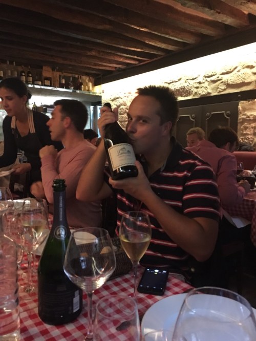 We eat so much: house-made foie gras and melted brie with baguettes, beef bourguignon and creme brûlée. Best of all, we have French champagne and, when we go to order 2 bottles of cote du rhône, the waiter suggests a Magnum instead and we are utterly delighted by the giant bottle of French red that soon lands on our table.