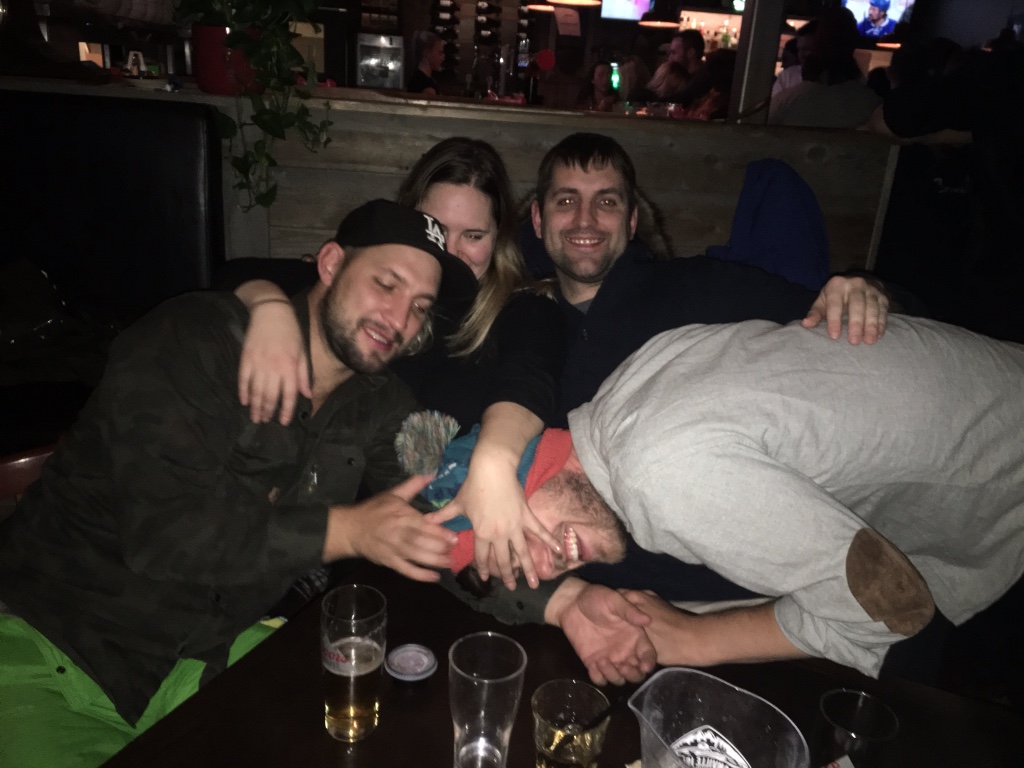We have the New Year's Eve I want to have every year from now on. There's a silly game of Kings in our hovel of a flat (which escalates quickly and soon there's a rule obliging my brother to pluck one of his own nose hairs every time he draws a face card), then fireworks on the snow, then jugs and jugs and jugs (why does the UK not do jugs?) of beer with our gang — me, brother, sister, cousins x 3, Nakiska, Bunky, Powerjam — and Flipper's — his parents, his sister and and her very Aussie boyfriend, the lovely new Swede– and then dancing to a live rock n roll band.