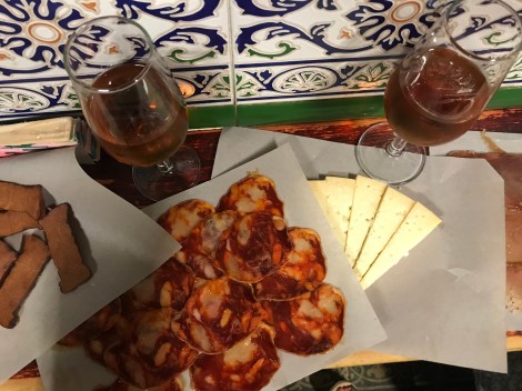 From Seville we take a surprisingly modern train down to Cadiz. I’m sure I’d have nicer things to say about Cadiz if we hadn’t just been deposited there from the beauty queen of a town that is Seville. It does not show to advantage in that contrast. For me, Cadiz will be defined in my memory by two things. First, the big hulking cruise ships and the cumquat-coloured Brits they disgorge onto shore. Second, the truly wonderful Casa Manteca which is the most classic Spanish tapas bar you could wish for. It’s run by two brothers, the sons of a famous matador, and it’s hot and crowded and the walls are lined with bottles of sherry and bullfighting tributes and paraphernalia. Having read about it on a blog, we seek it out around 6pm on a Saturday evening. There’s nowhere to sit. You order at the bar. A beautiful Spaniard points and tells you to wait and, soon, metal platters of greaseproof paper and cured meets and manchego are before you. The floor is littered with balls discarded greaseproof paper — a good sign. For me, this little corner bar, with patrons sipping little glasses of sharp sherry and spilling out onto the pavement from every door into the dark night towards the beach, will be my Spanish archetype. It is perfect.